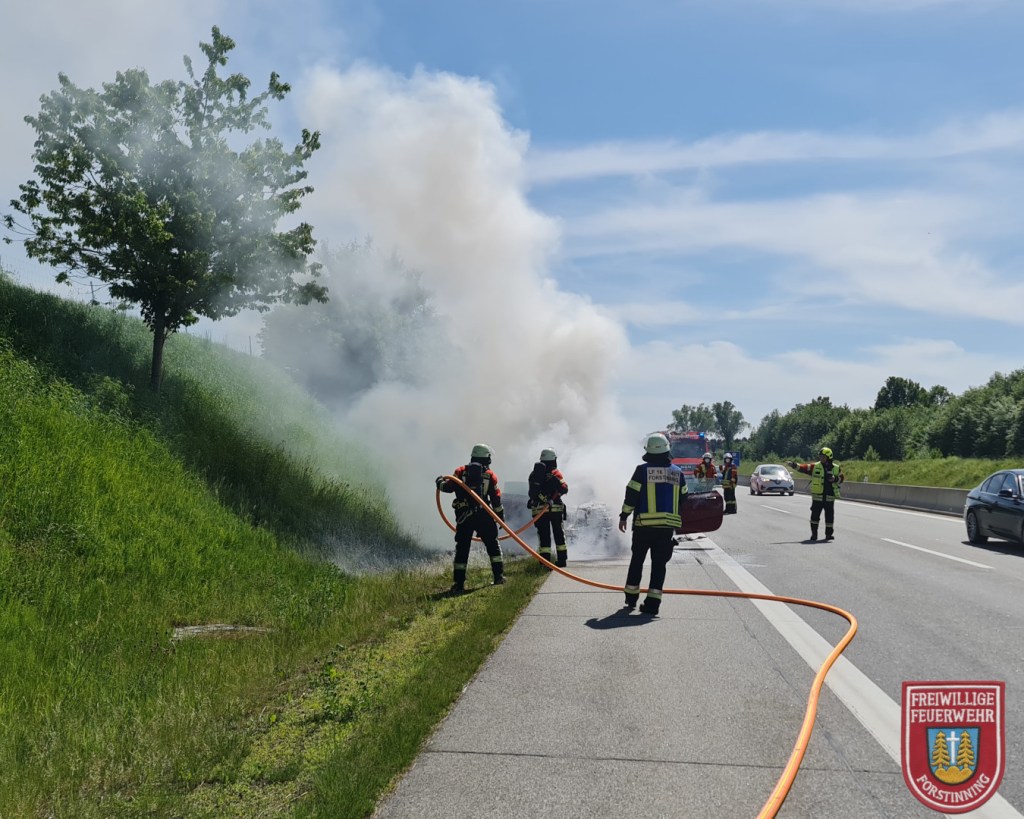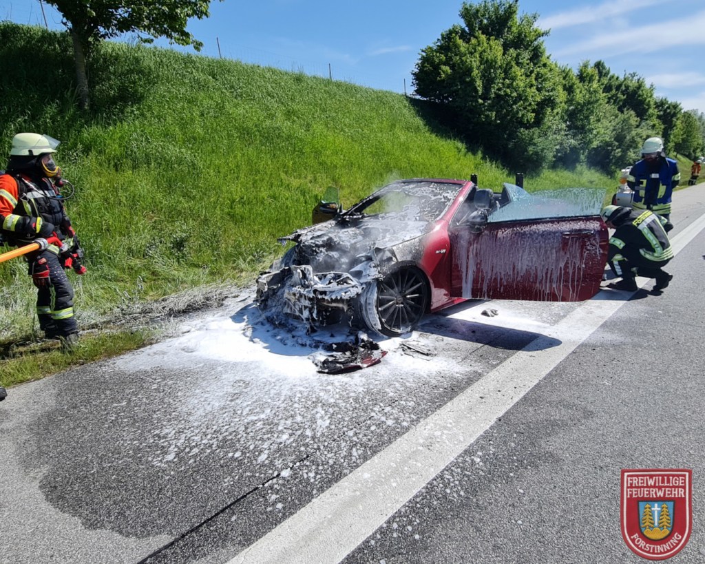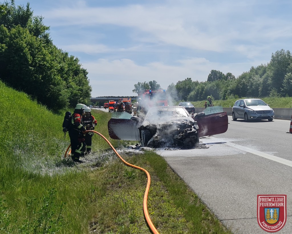 Am Sonntag, den 22.05.2022, ging um 15:01 Uhr ein Alarm bei uns ein. Auf der A94 in Richtung Passau stand zwischen den Anschlussstellen Forstinning Ost und Pastetten ein PKW in Vollbrand. An der Unfallstelle angekommen stellten wir fest, dass infolge einer Kollision eines Kleintransporters und des PKWs, der Motorraum des Wagens Feuer gefangen hatte und bei unserem Eintreffen bereits in voller Ausdehnung brannte. Alle Insassen konnten sich rechtzeitig aus dem Fahrzeug befreien und blieben unverletzt. Dank unseres neuen HLF und der CAFS-Schaumanlage konnten wir den Brand sehr schnell und effizient unter Kontrolle bringen und ein Ausbreiten auf Sträucher verhindern. Die Kameraden der FW Anzing kamen zur Unterstützung hinzu, und leisteten Hilfe bei den Aufräumarbeiten, sodass die Vollsperrung der A94 schnell wieder aufgehoben werden konnte.