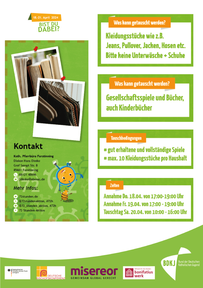 Dieses Jahr ist mit Blick auf das Thema der Nachhaltigkeit in Forstinning eine Tauschbörse vorgesehen. Welche Produkte getauscht werden können und wie der zeitliche Ablauf ausgestaltet ist, kann den beiliegenden Flyern entnommen werden. Ausdrücklich weisen wir allerdings auf den Tauschtag Samstag, den 20. April hin, bei dem es auch Kaffee, Kuchen und herzhafte Verpflegung geben wird.