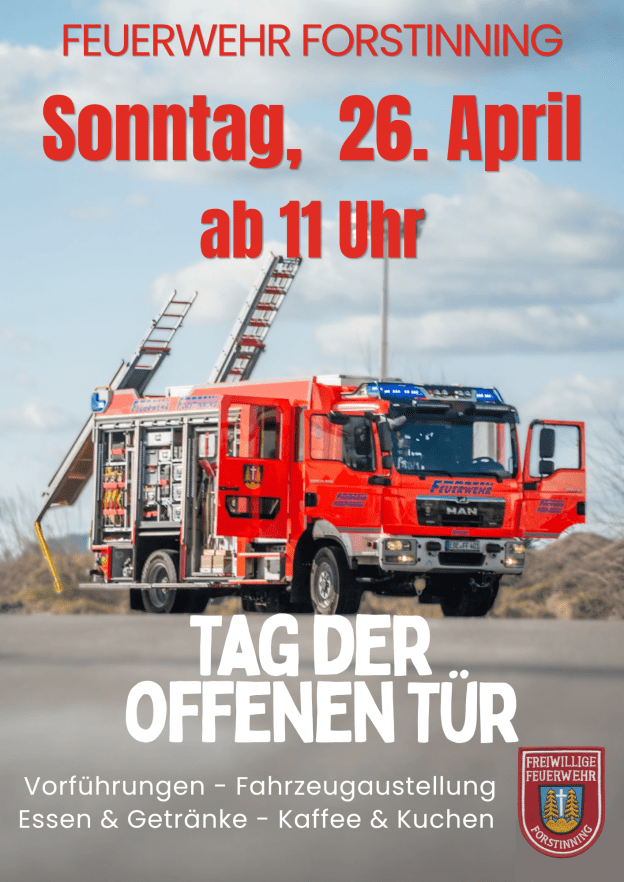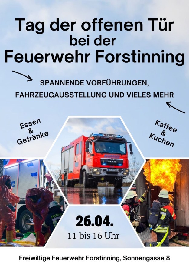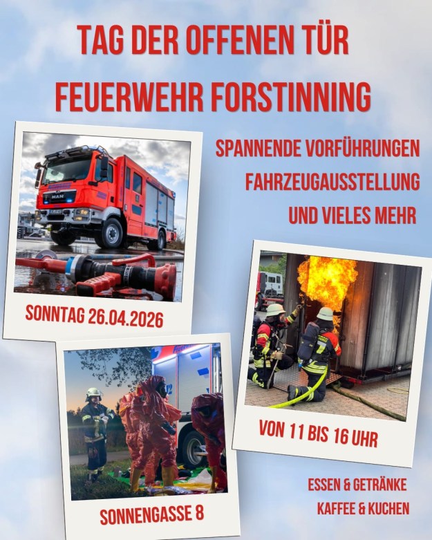 Die Feuerwehr Forstinning lädt am kommenden Sonntag, den 26. April 2026 zum Tag der offenen Tür ein. Von 11 Uhr bis 16 Uhr haben Besucherinnen und Besucher die Gelegenheit, die Feuerwehrarbeit kennenzulernen und zum Teil auch selbst auszuprobieren. Die Veranstaltung findet im Feuerwehrhaus Forstinning (Sonnengasse 8) statt und richtet sich an alle Interessierten – von Familien mit Kindern bis hin zu echten Feuerwehrbegeisterten.