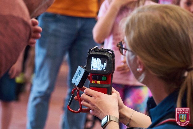 Um unsere Kernaufgaben auch in Aktion zu zeigen, führten wir dem interessierten Publikum eine anschauliche Übung an einem Miniatur-Brandhaus vor. Wir simulierten auf kleiner Skala einen klassischen Zimmerbrand, bei dem wir den Effekt der Rauchdurchzündung (Backdraft) zeigten, bei dem sich der entstehende Brandrauch schlagartig entzündet.