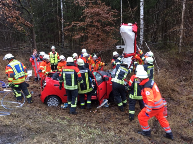 Die alarmierten Feuerwehren retteten ihn, mit Spreizer, Schere und Hydraulikzylindern, sowie der Kettenzug Methode aus seinem Wrack.