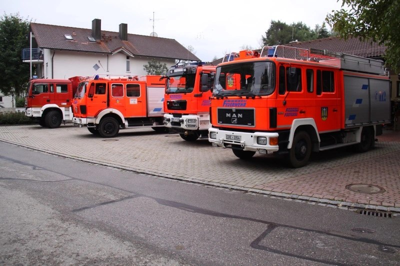 Nachstehende Bilder zeigen den Fuhrpark über die Jahre. Im wohl ältesten der Bilder sind noch die Vorgängermodelle zu sehen, die vermutlich ein altes Mehrzweck- oder Führungsfahrzeug zeigen. In der Mitte auf dem selben Bild ist ein altes Löschfahrzeug zu sehen. Details zu beiden Fahrzeugen liegen uns leider nicht mehr vor.