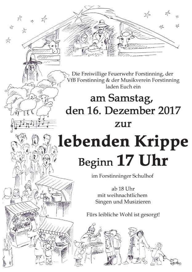 Am kommenden Samstag ist es wieder soweit. Wir laden zusammen mit dem Tischkegelklub und dem Musikverein zur lebenden Krippe ein. Wie jedes Jahr stimmen wir uns alle auf die Weihnachtszeit in gewohnter Weise ein. Neben der lebensechten Krippe mit Tieren, Hirten und dem heiligen Paar laden wir ein zu herzhaften und süßen Speisen bei denen eine Tasse Glühwein oder Kinderpunsch nicht fehlen darf. Stimmungsvoll begleitet uns dieses Jahr wieder der Musikverein Forstinning. Wir freuen uns auf euch um 17 Uhr im Schulhof der Grundschule Forstinning.
