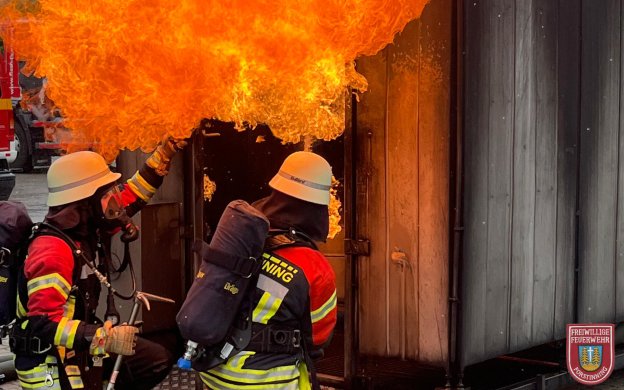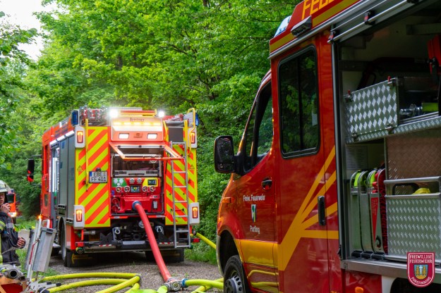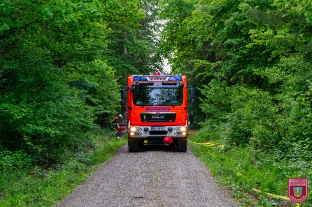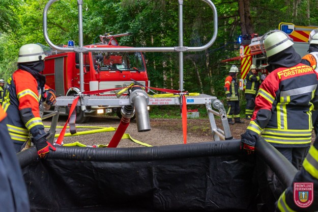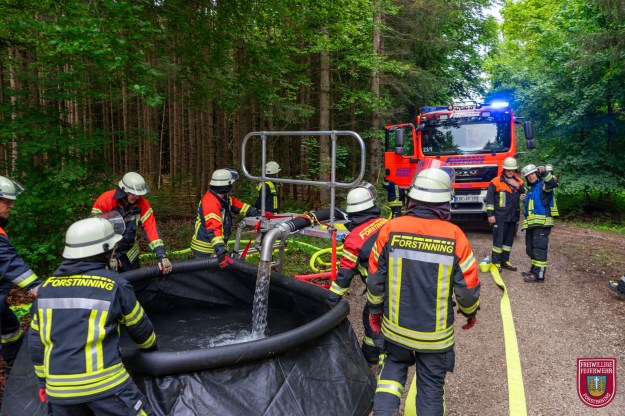 Angenommenes Einsatzbeispiel war der Vollbrand einer Maschine im Wald mit umliegendem Bodenfeuer, das bereits von einer Lichtung bis in den Wald fortgeschritten war. Die ersten Einsatzkräfte gingen zunächst mit einer speziellen Taktik gegen die weitere Ausbreitung vor und grenzten den Flächenbrand ein. Parallel dazu richteten wir zusammen mit der Feuerwehr Purfing und deren Tragkraftspritze einen Wasserumschlagplatz mit unserem 5000 Liter Faltbehälter ein, der von einem Pendelverkehr mit drei Tanklöschfahrzeugen (je mindestens 4000L Wasser) der Feuerwehren Parsdorf-Hergolding, Steinhöring und unserem befüllt wird.