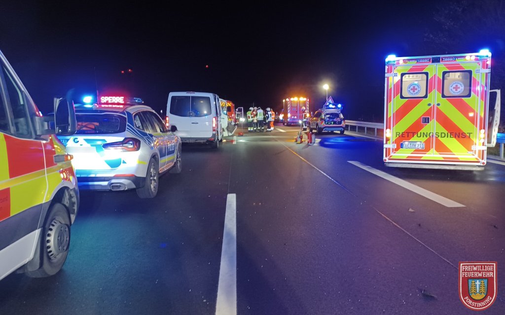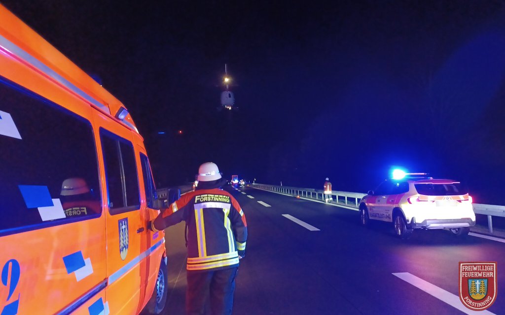 Am Dienstagabend um 23:02 Uhr wurden wir zusammen mit der Feuerwehr Anzing auf die A94 zu einem Verkehrsunfall alarmiert. Kurz nach der Anschlussstelle Forstinning in Fahrtrichtung München waren ein LKW und ein voll besetzter Kleintransporter zusammengestoßen.