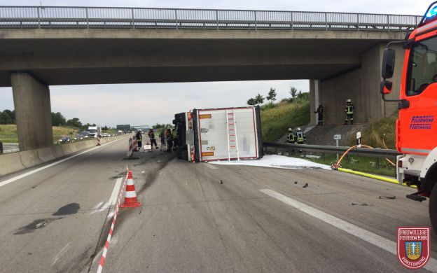 Am frühen Freitagabend, den 19.07.2024, wurden die Feuerwehren Anzing und Forstinning zu einem verunglückten LKW auf die A94 Fahrtrichtung München alarmiert. Durch den Unfall geriet der LKW, der Leergut geladen hatte, in Seitenlage.