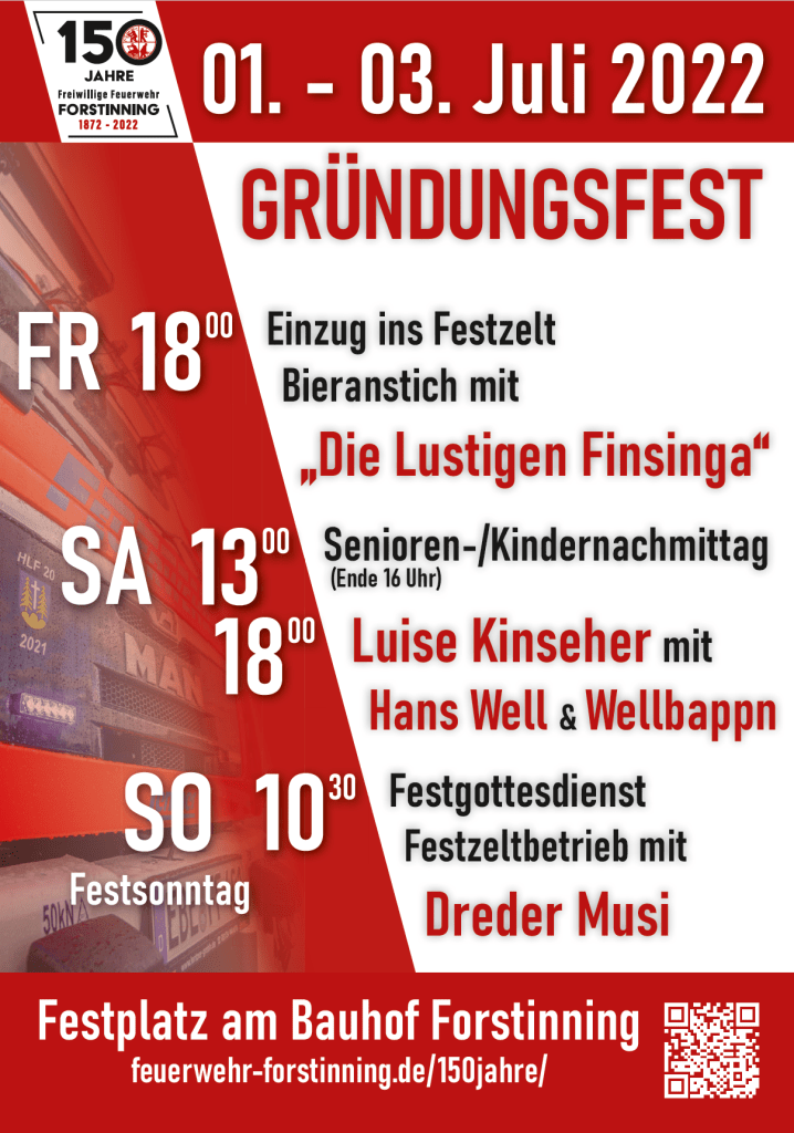 Das Programm für unser Gründungsfest steht fest. Wir feiern 3 Tage zusammen mit den Vereinen, Firmen und Bürgern Forstinnings und allen anderen unser 150-jähriges Bestehen. Dazu starten wir am Freitag mit einem Einzug in unser Festzelt am Bauhof Forstinning. Mit Bier der Brauerei Schweiger startet dann unser Festwochenende bei Musik von den LuFis.